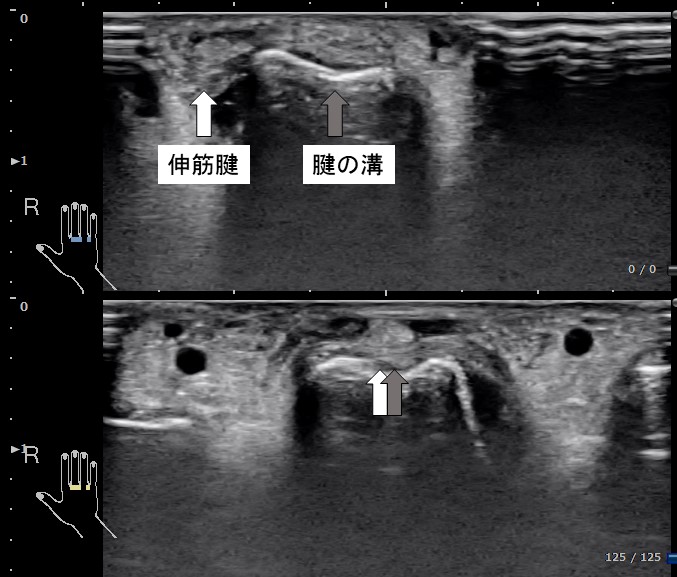 超音波エコーで観察された画像をお示しします。上図が屈曲時、下図が伸展時の中指MP関節部の腱と腱溝の関係を示します。屈曲すると腱溝から腱が外れてしまいます。
